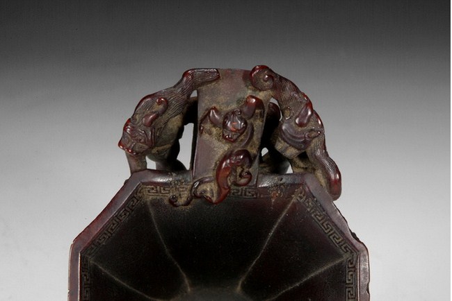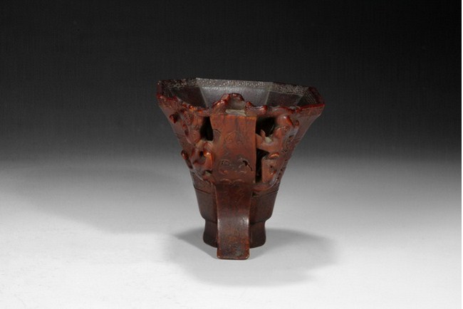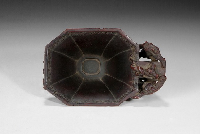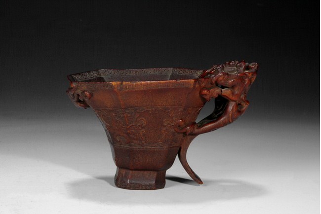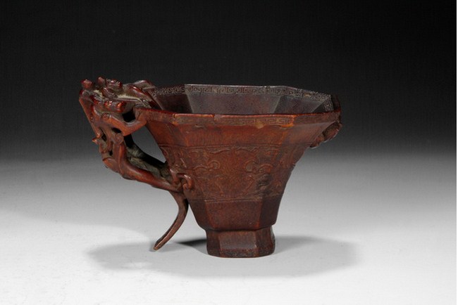 A rhinoceros cup of octagonal section, carved around the sides with band of taotie reserved on a leiwen ground, the curved strap handle flanked by two clambering chilong and surmounted by a smaller, with a further chilong just below the rim on the opposite side, the mouth and foot incised with key-fret bands. 17/18th century