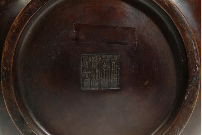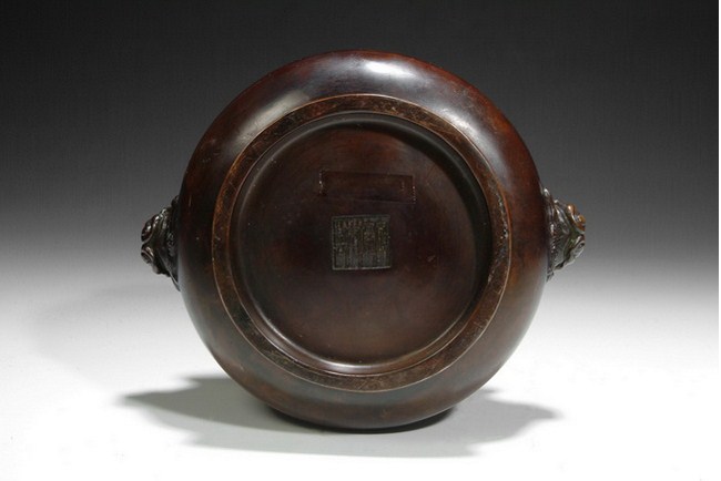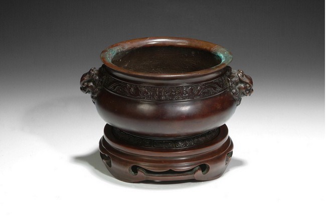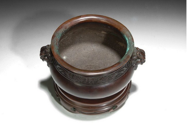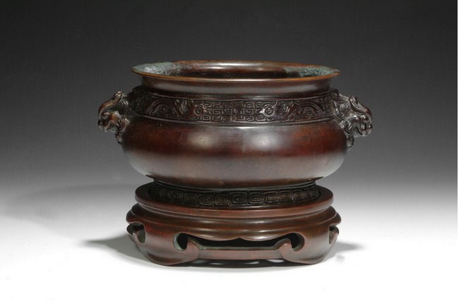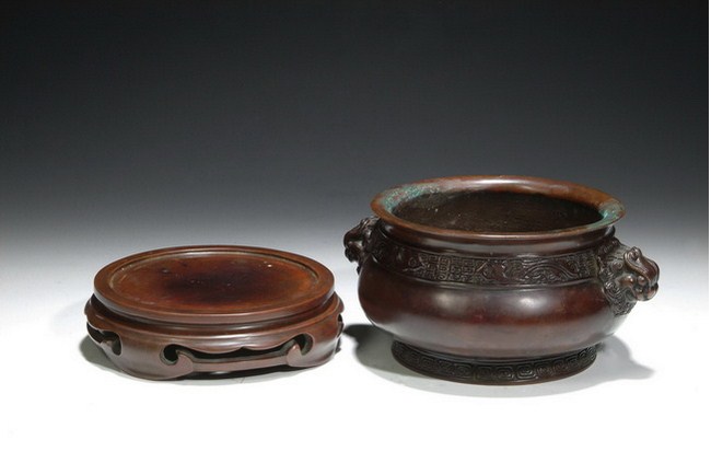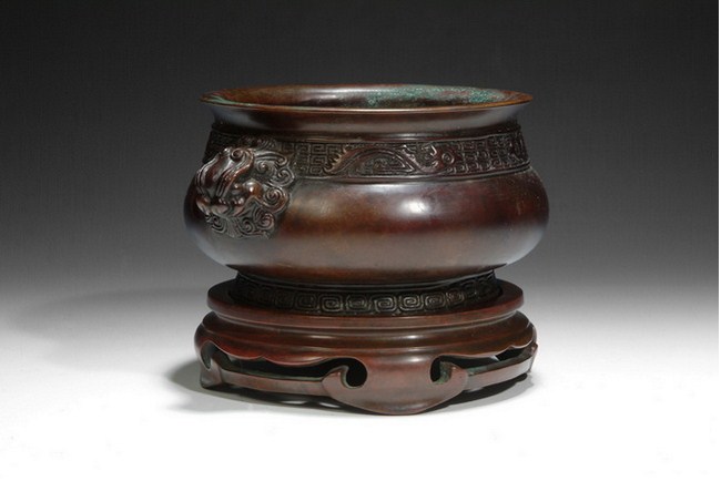 The bronze censer has a round foot ring, leading to a flattened round body, and slightly everted rims. Leiwen patterns covers the entire foot ring and waist, while two lion mask handles situated on two sides of the body. The bottom bears four character mark "XUANDE". The censer is completed with original bronze base. Qing Dynasty period.