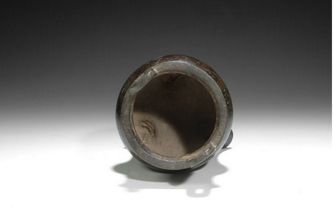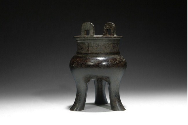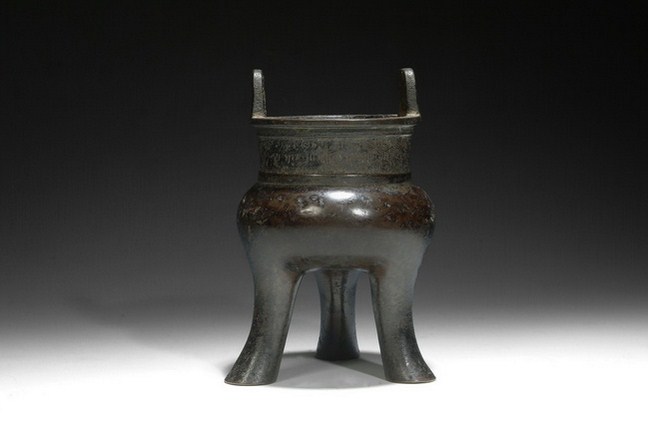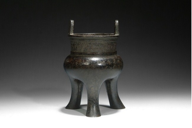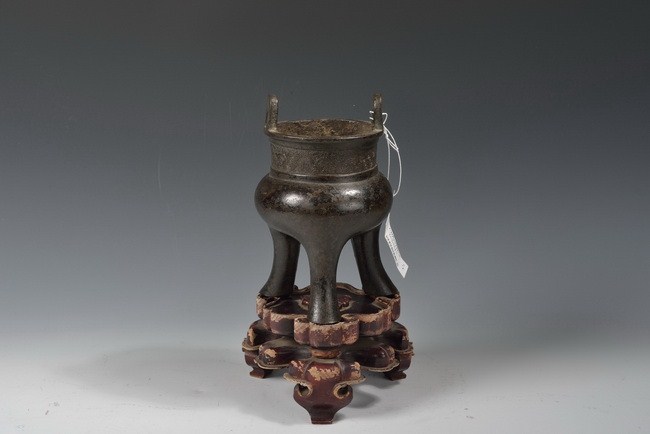A bronze censer with two uplift handles, and resting on three long tapered legs that extends outward. There's a ribbon of cast geometric patterns under the rim. Qing Dynasty period.
