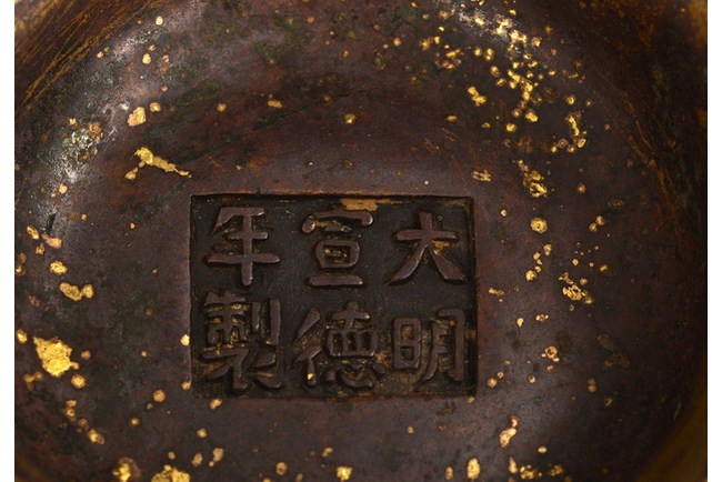 A bronze gilt splashed censer with two animal handles and a high foot ring. The base is casted with six characters "XUANDE" mark. Qing Dynasty period.