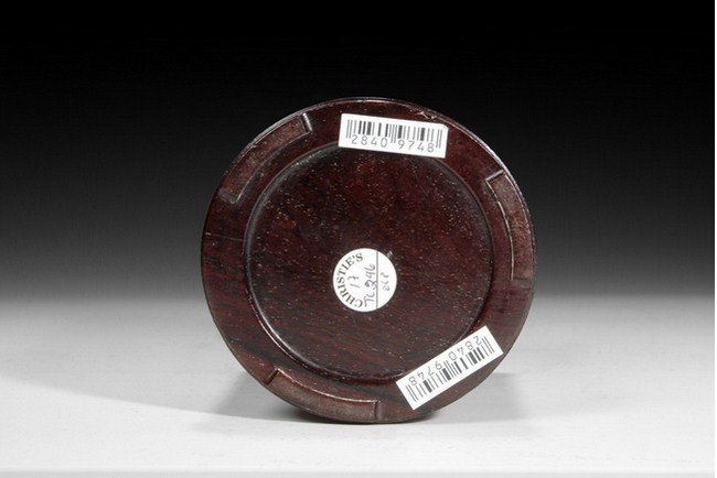 An intricately carved bamboo brush pot, depicting a continuous landscape scene. The brush pot is finished with hardwood rim and base. Qing Dynasty period.
