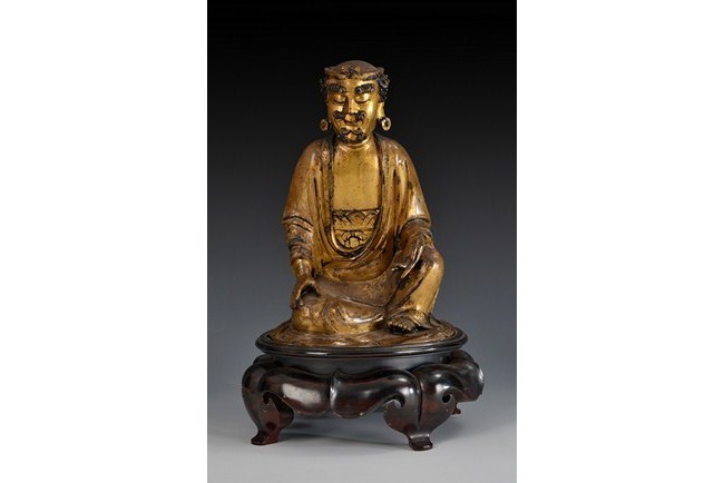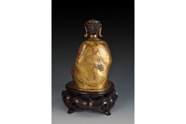 The gilt bronze Arhat statue is in a sitting posture, dressed in robe, with serene expression, and eyes closed. It is completed with a hardwood base. Qing Dynasty period.