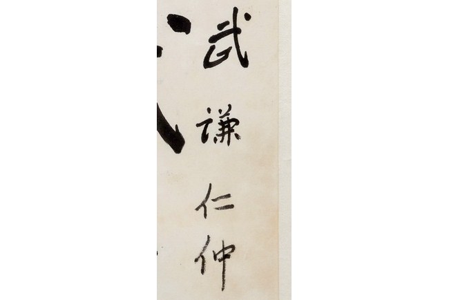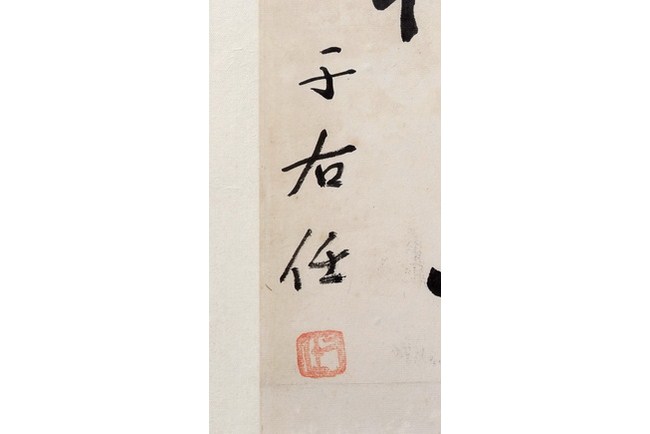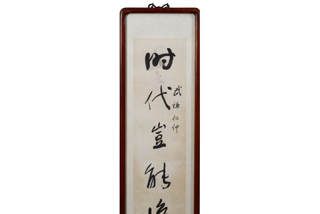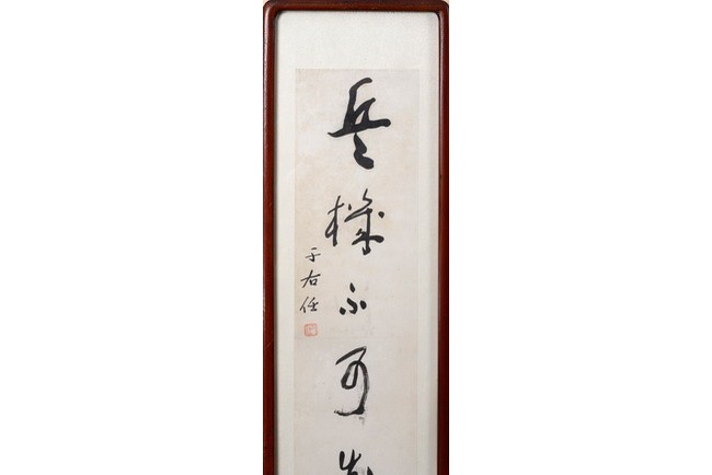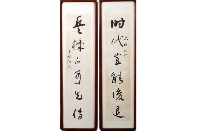 A pair of couplet calligraphy within a hanging frame. The couplet bears the signatures of "YU YOUREN" and seal mark.