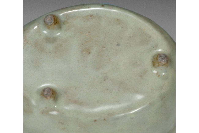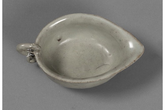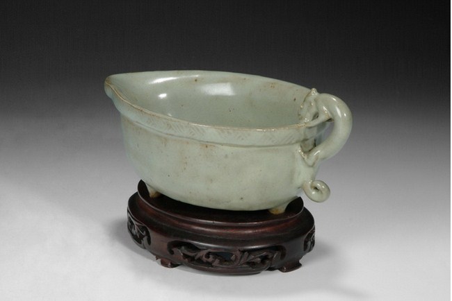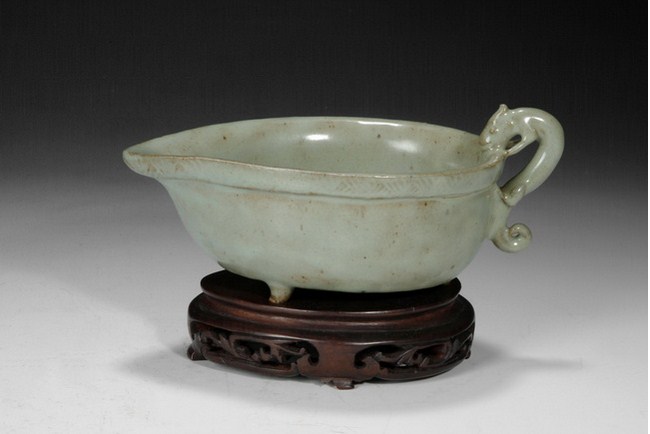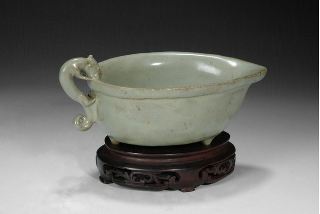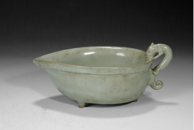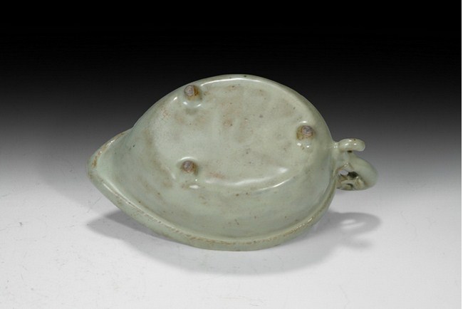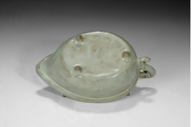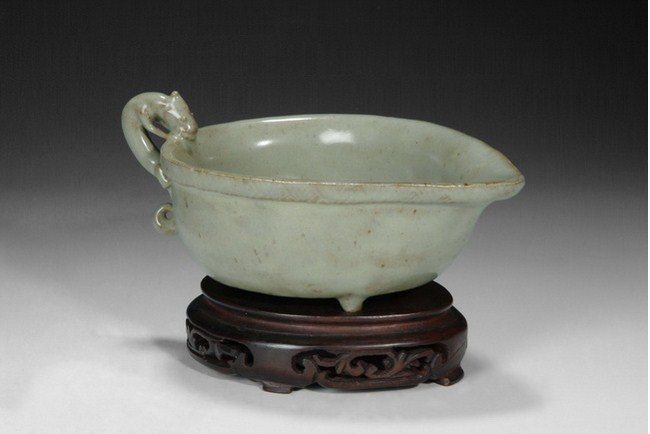 The celadon brush washer is in the form of a peach, and the handle sculpted as a Chilong. It stands on three short legs. The wall of the inner well bears fine crackles, typical of the early celadon pieces. Song Dynasty period.
