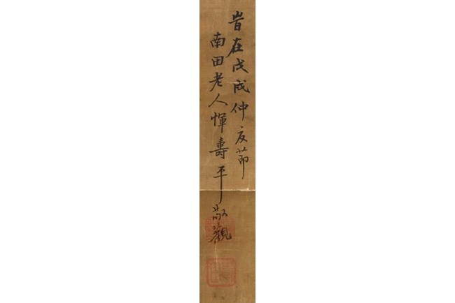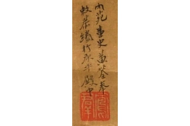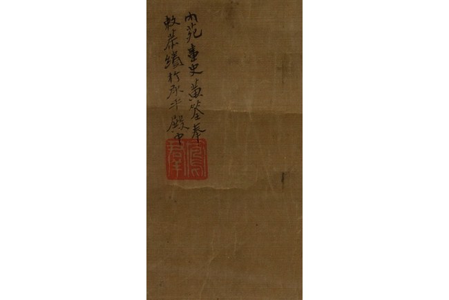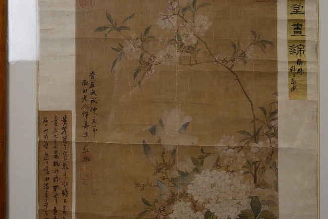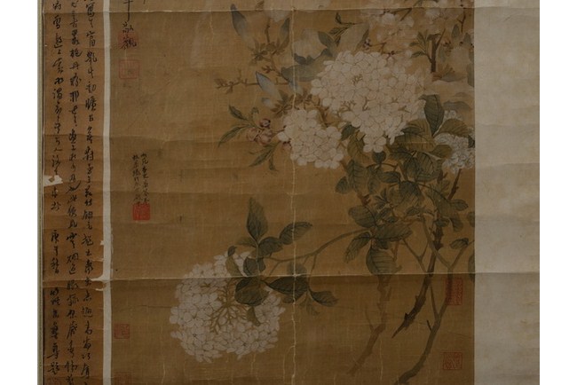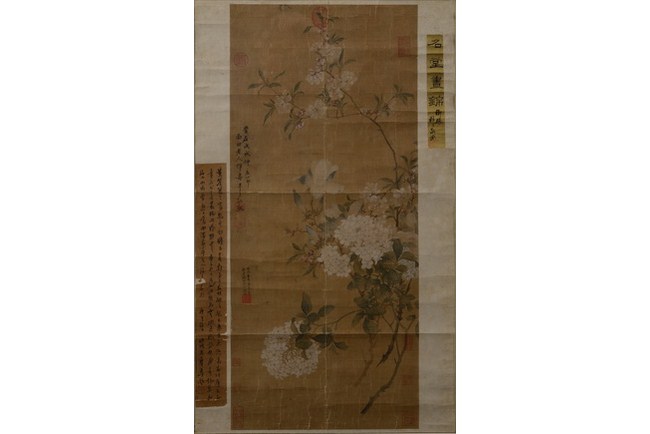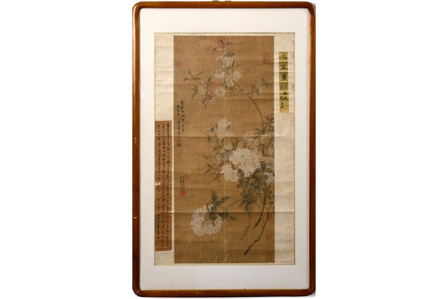 A Chinese painting on silk depicting a blooming branches of flowers. Two colophons on both sides of the drawing. Attributed to "YUN SHOUPING".