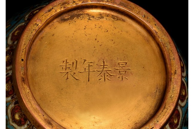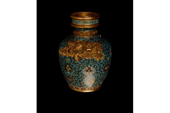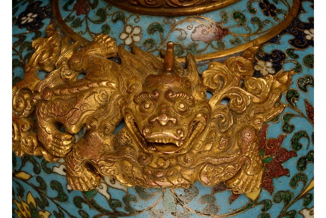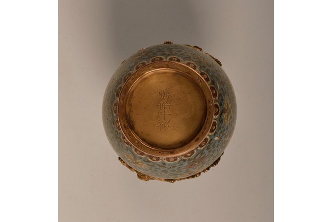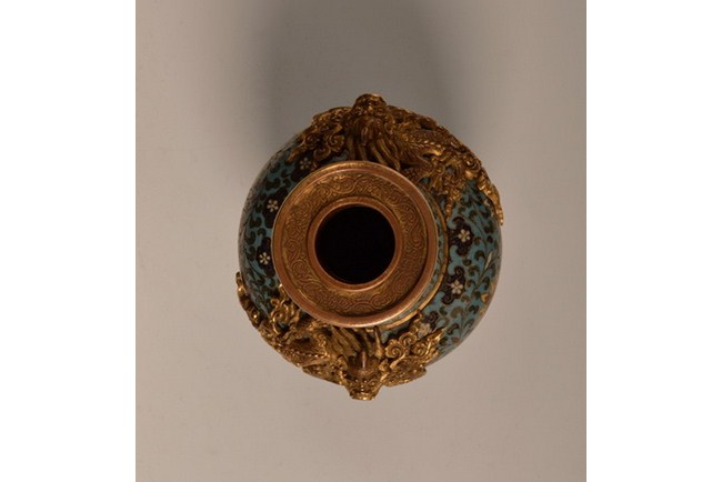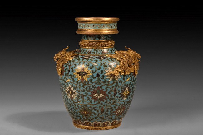 A beautiful cloisonne vase accentuated with two gilt Chilong, and the body is designed with lotus blossom. The base bears a four character "JINGTAI" mark. Ming Dynasty period.