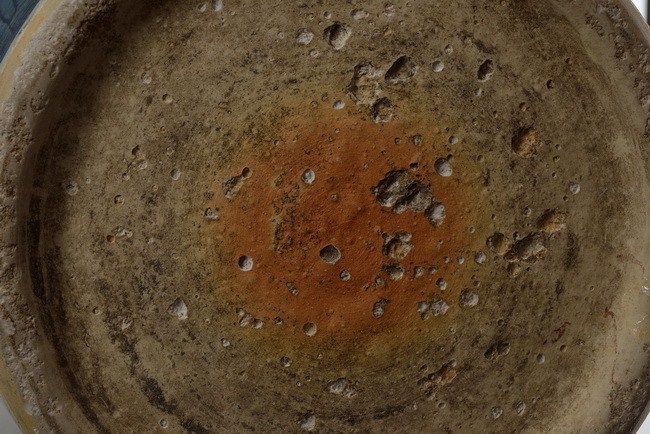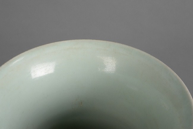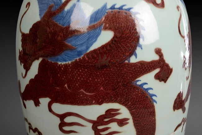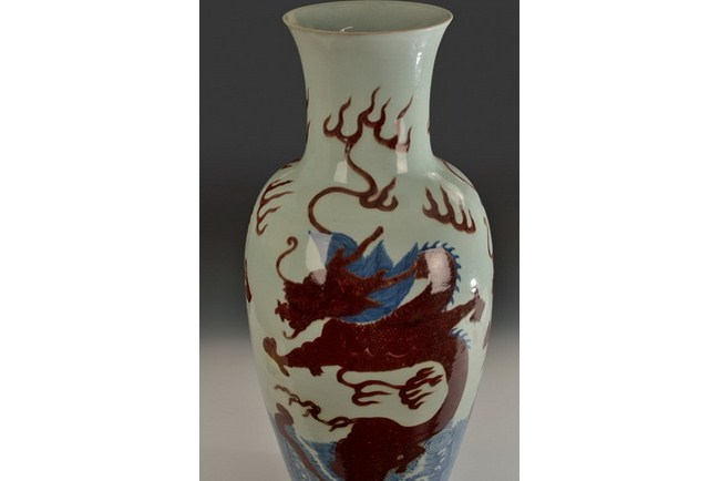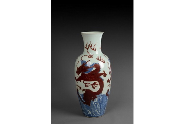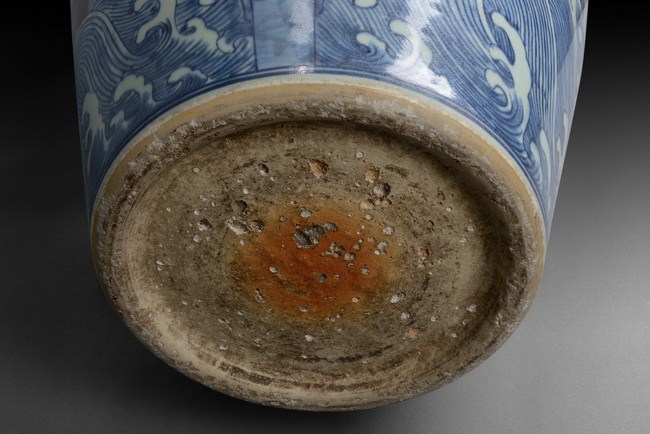 A large blue and white vase with the design of a five clawed dragon among stormy waves. The base is unglazed. Qing Dynasty period.