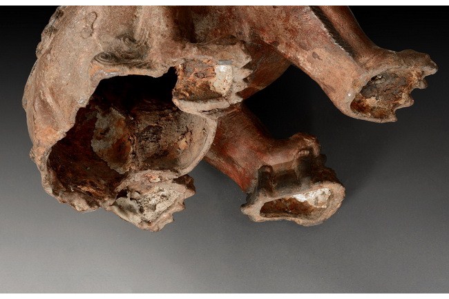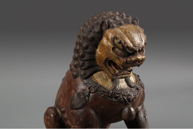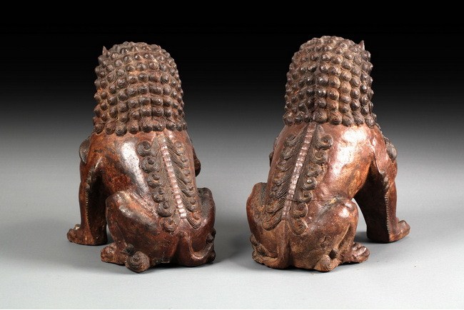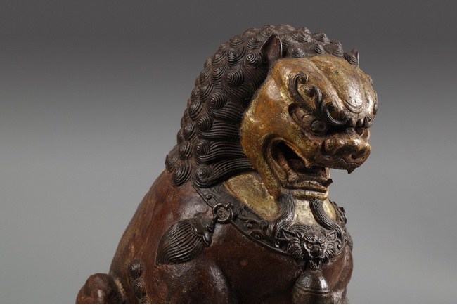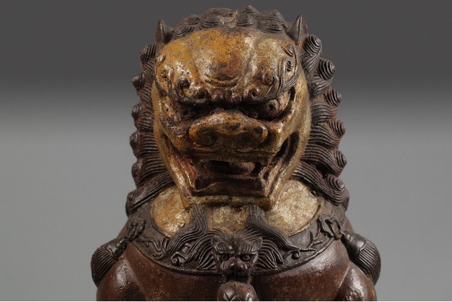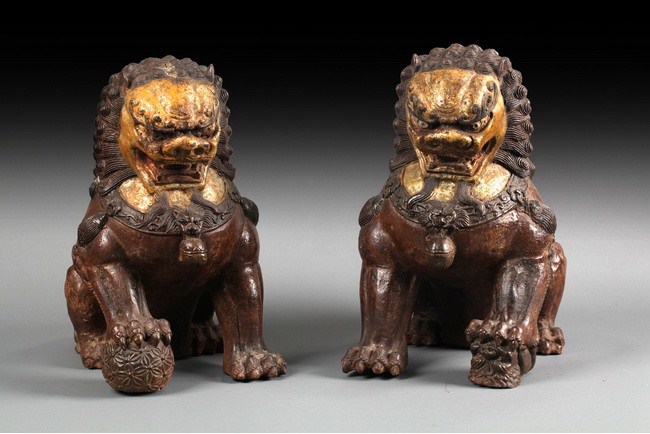 A pair of finely cast iron lions consisting of a lion and a lioness, with painted gold enamel. Early Ming Dynasty period.