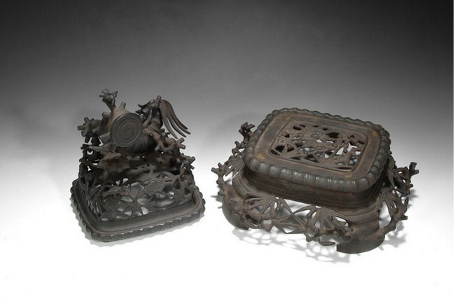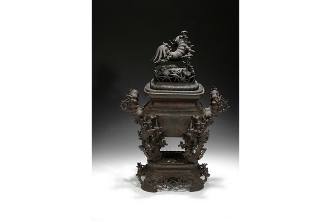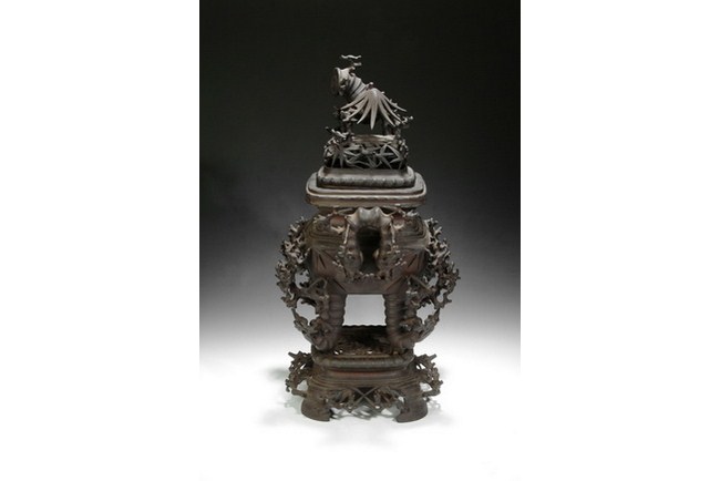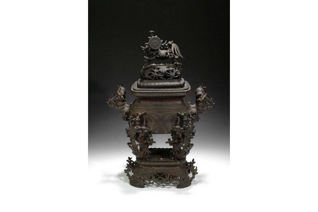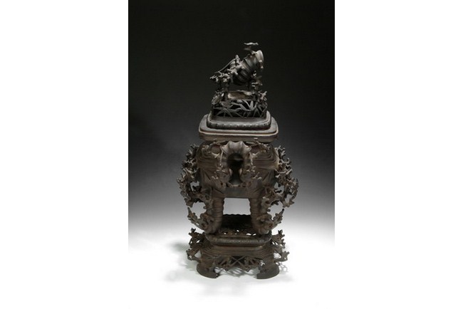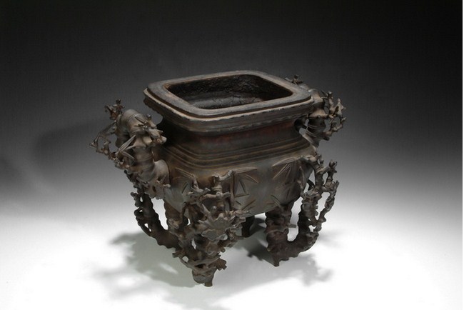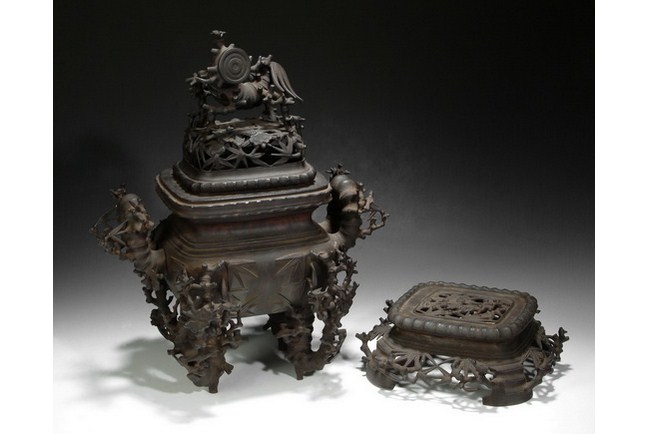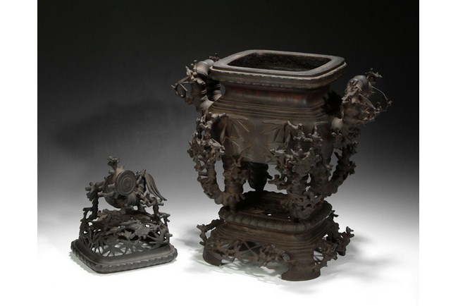 An elaborately casted bronze censer completed with the en suite cover and base, imitating bamboo patterns. Qing Dynasty period.