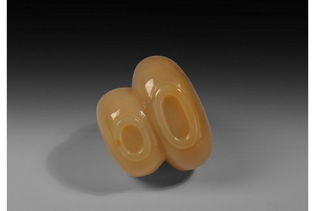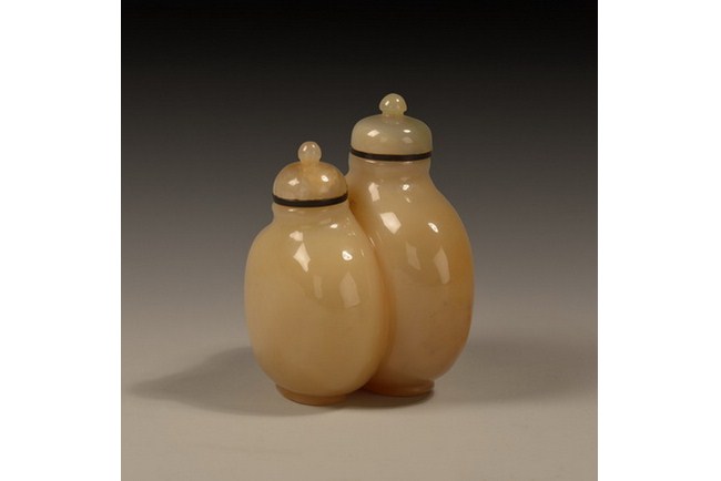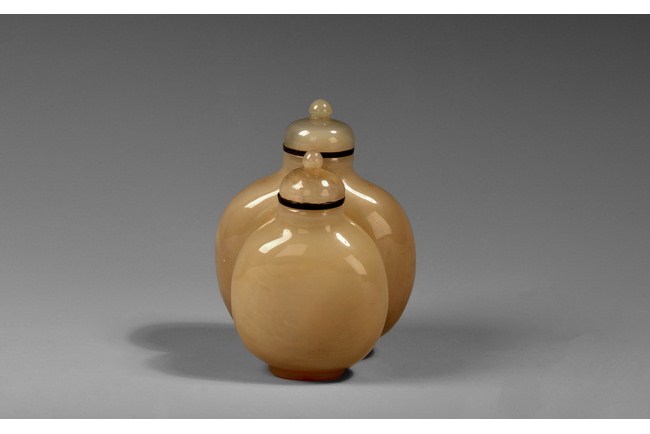 The twined agate snuff bottle has two snuff bottles attached, each with its own footring and stopper. Qing Dynasty period.