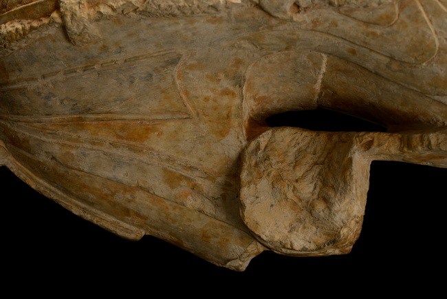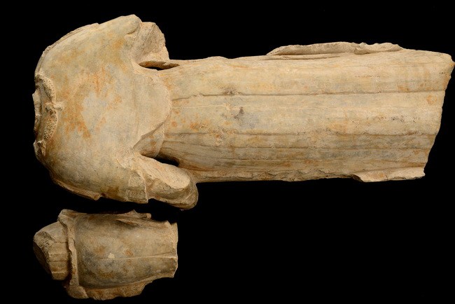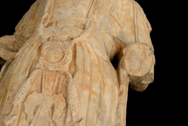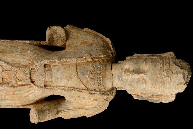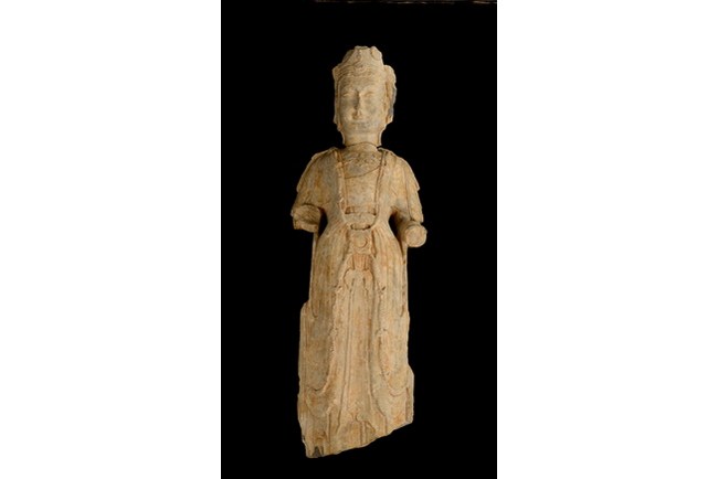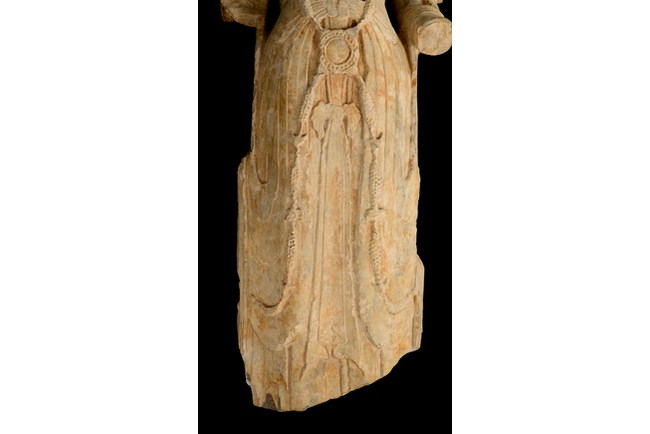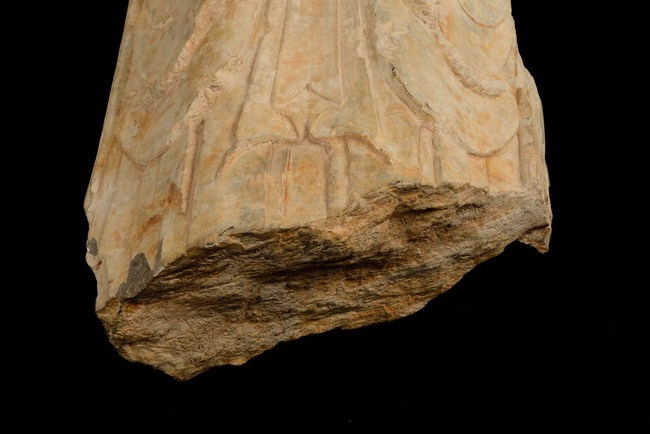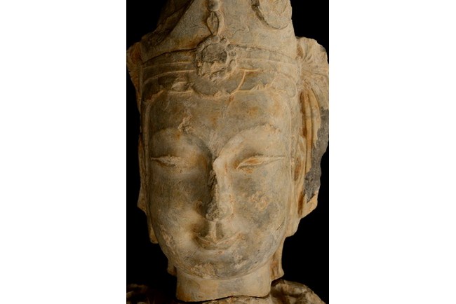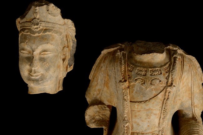 The stone Buddha statue was separated into two pieces, the head and the body. The statue was intricately carved, depicting a smiling Buddha with closed eyes, serene expression, and upward lifting lips. Both hands are missing from the statue, as are some other parts. Northern Wei Dynasty.