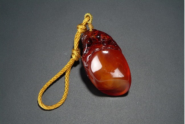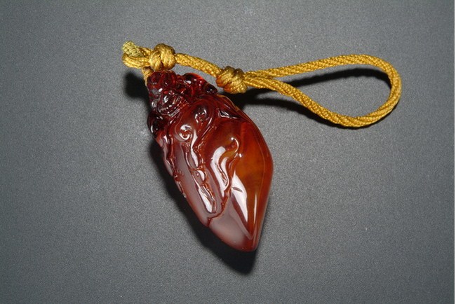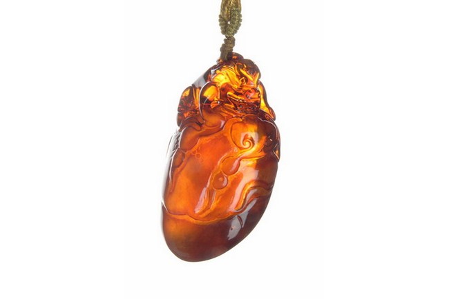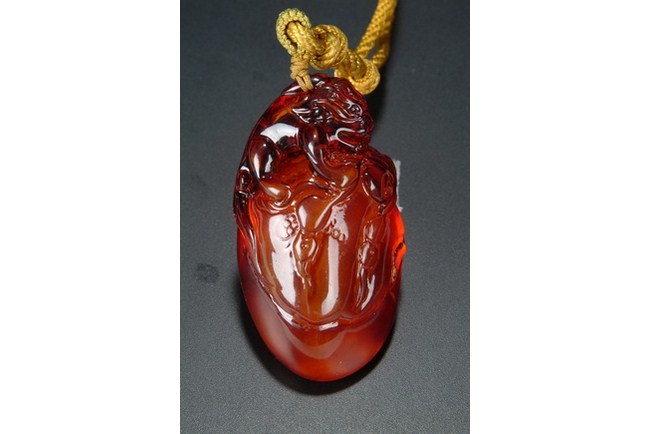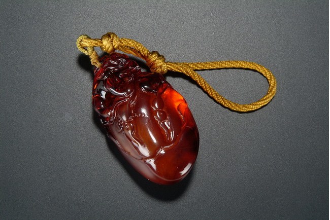 A well carved amber pendant, surmounted by a horned Taotie on top of carved peach, ruyi, and double gourd. Qing Dynasty period.