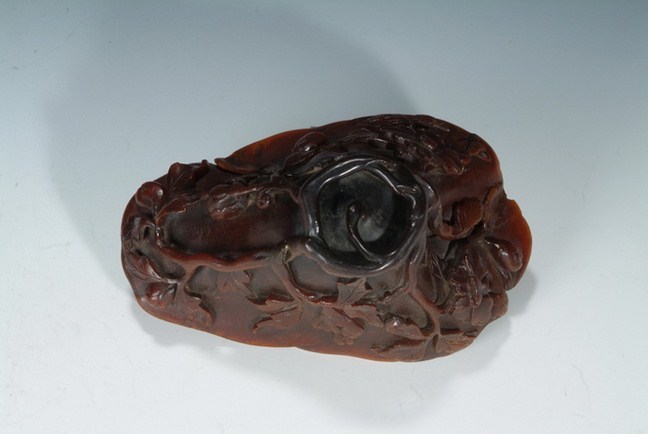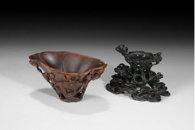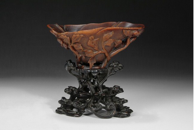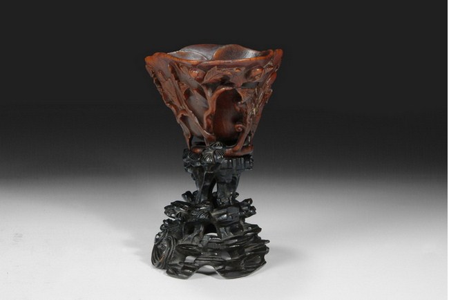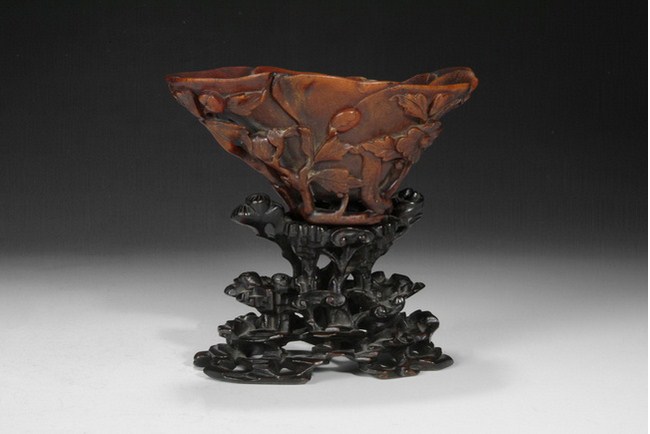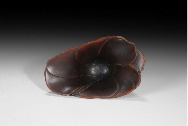 The cup was carved as an open peony blossom with overlapping petals, borne on a curling branch that forms the openwork base, with secondary leafy flowering branches that extend up the sides, some forming the handle, the material of a deep amber color darkening towards the base. 17/18th Century.