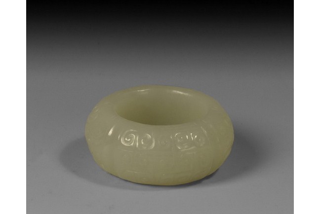 The white jade ring has complex patterns on the entire exterior band.