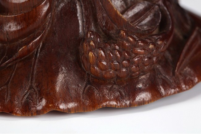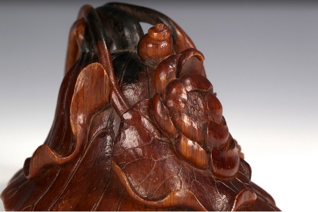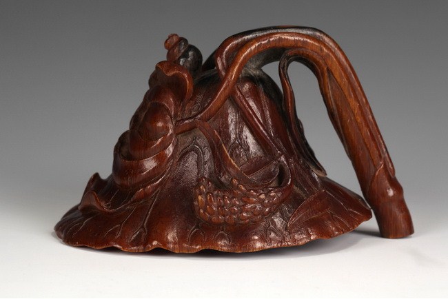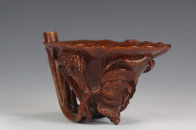A finely carved rhinoceros horn decorated with a branch of lotus leaves and blossom. The undercut entwined to form the handle. The horn of rich amber color, darkening toward the base. Qing Dynasty period.