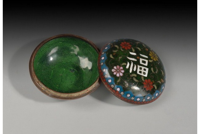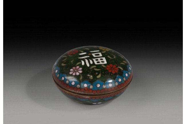 The cloisonne enameled seal paste cover box has colorful border patterns, flowers on the top of the box, and a Chinese character "Fu" at the center, indicating fortune. Qing Dynasty period.