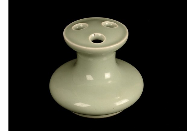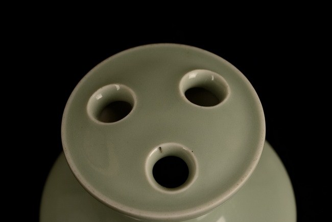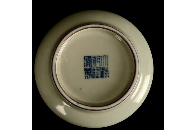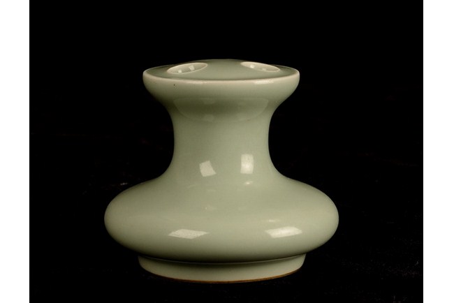 A small flattened baluster vase covered overall with celadon glaze. The base bears a four character "QIANLONG" mark. Qing Dynasty period.