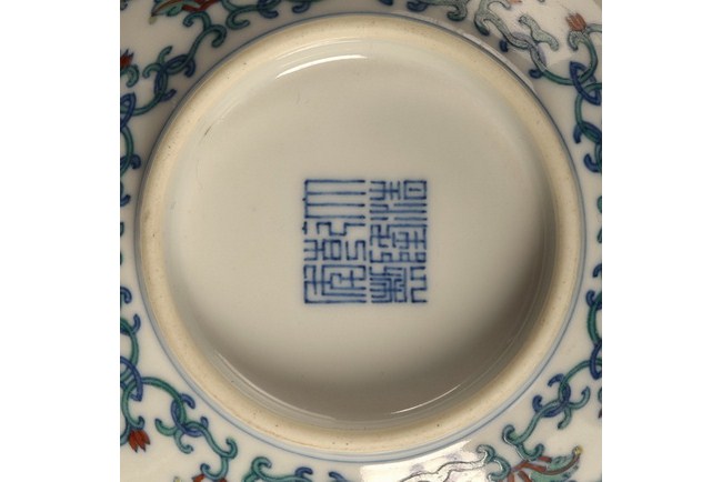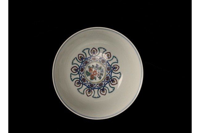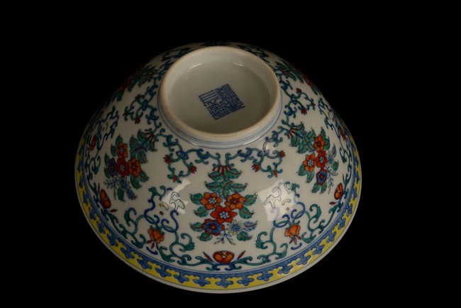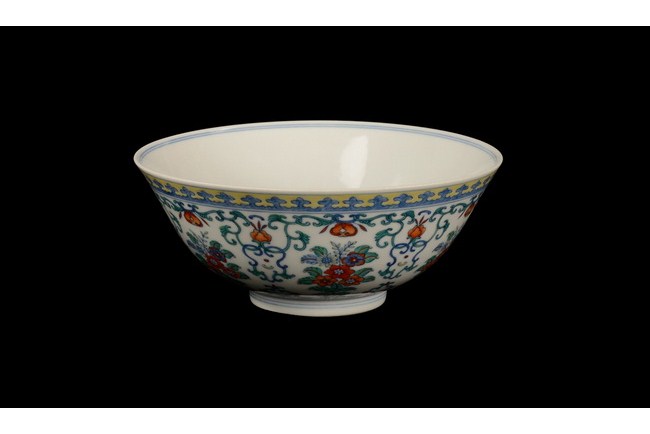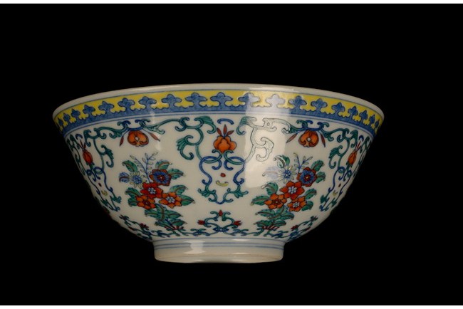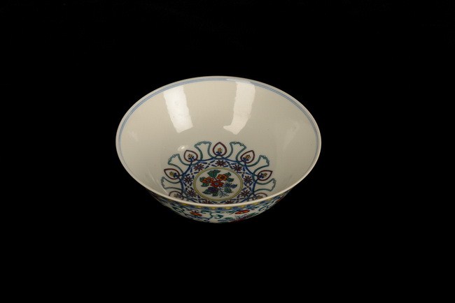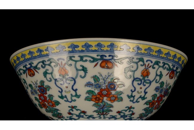 A well potted Doucai bowl with designs of flowering branches on the side, capped with a continuous band of ruyi pattern, and the base bears a six character "QIANLONG" mark. Qing Dynasty period.