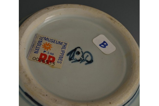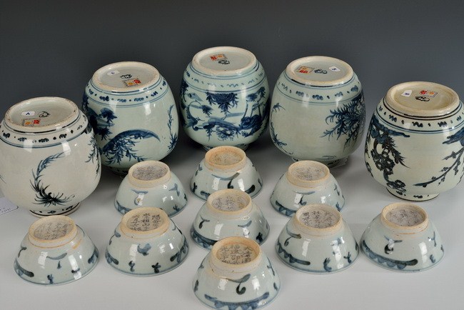 A set of late Ming underglazed blue and white items crafted from provincial kilns, consisting of 9 bowls of various sizes, and 5 flasks, each decorated with free hand design. Inside wall and base are unglazed, some have caricatures stating the intended customers. Ming Dynasty period.