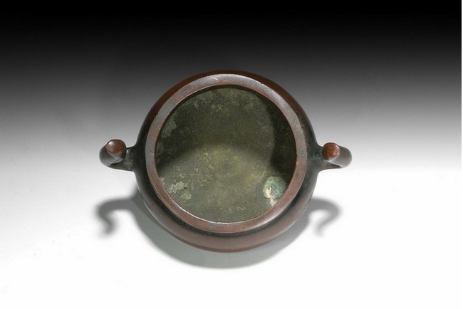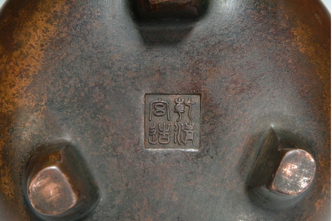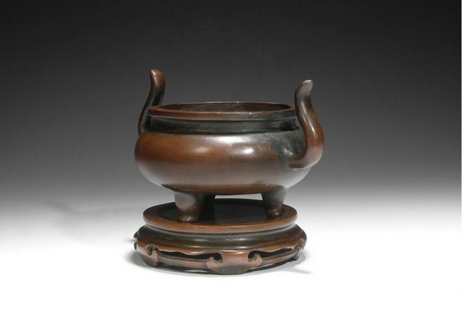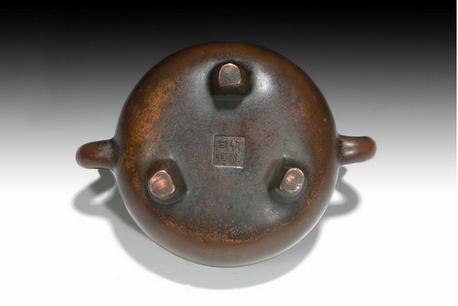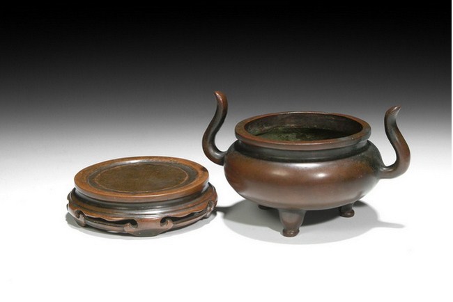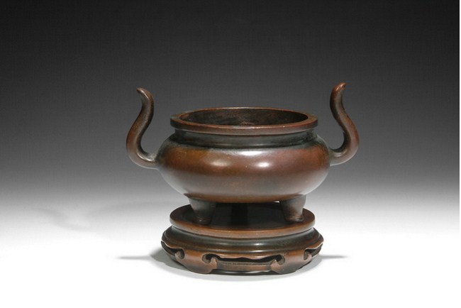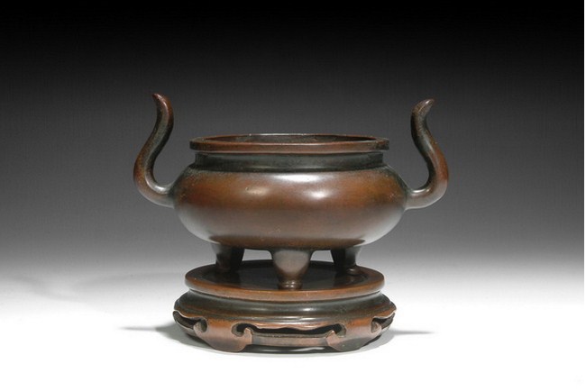 An elegantly cast bronze censer with two upward pointing handles and the body rest on free solid legs. There is a mark of "QIAN JING GONG ZAO" at the base. The censer is completed with a bronze stand.