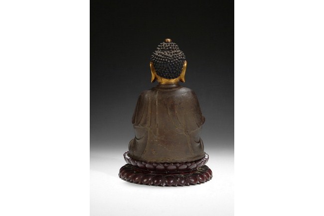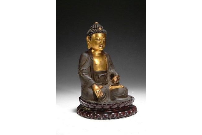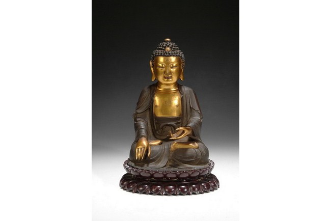 A gilt bronze Siddhartha Gautama Buddha with his hand touching earth, with left hand is dhyana mudra, and right hand in bhmumisparsa mudra. The Buddha has benevolent face, with downcast eyes flanked by long pierced earlobes. The piece is completed with a carved hard wood lotus throne base. Qing Dynasty period.