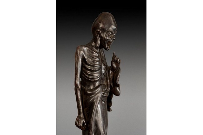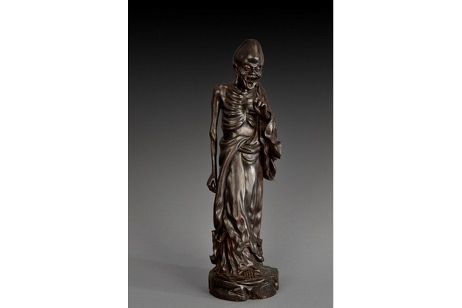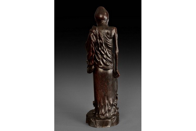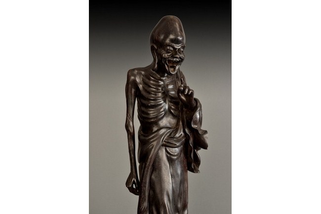 A tall and well carved Amitayus, standing straight, with flowing robe that covers mostly his lower body, showing half bare chest of skin on ribcage, serene gaze, and mouth wide open in laughter. Qing Dynasty period.