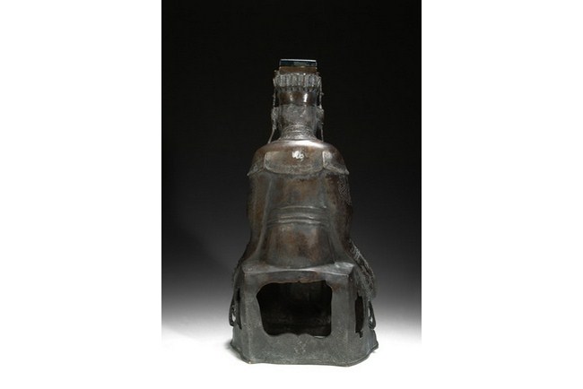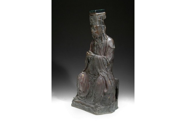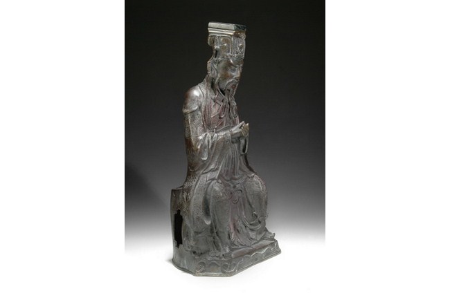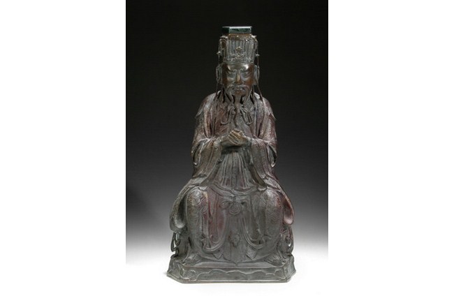 A bronze statue cast in the form of a Daoist deity, sitting on a plinth. He has two hands clasped together, with eyes closed, and has a stern expression. Ming Dynasty period.
