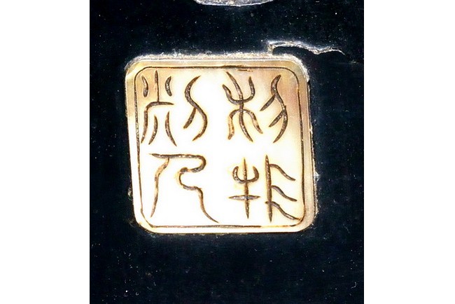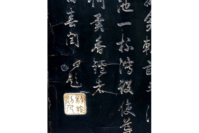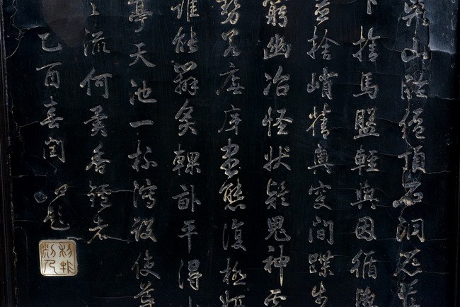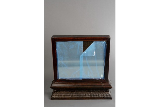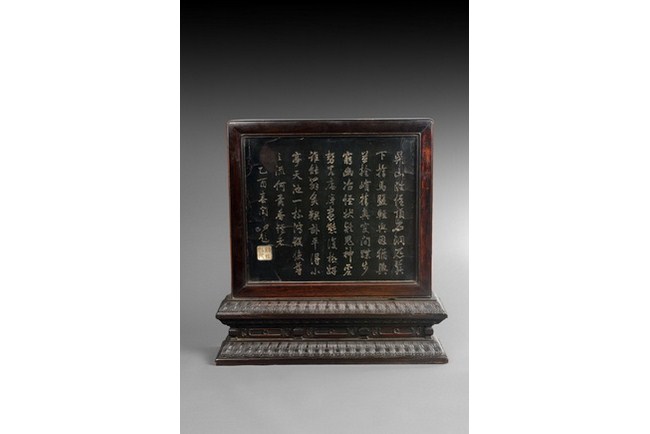 A lacquer floor screen with a mirror and carved calligraphy panel inset within a square frame, which sits on top of a base carved with downward pointing lotus petals. Qing Dynasty period