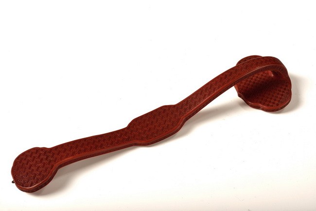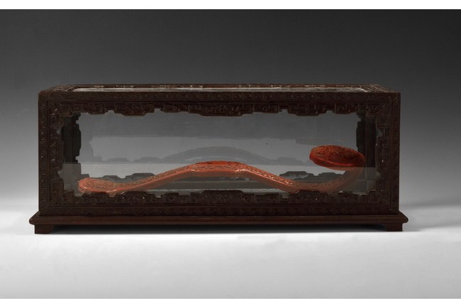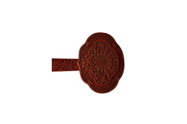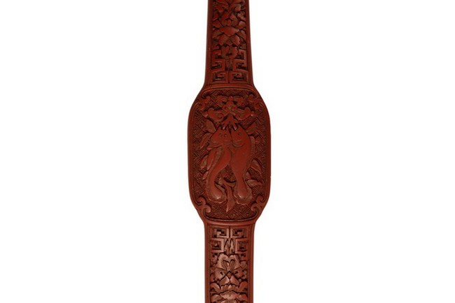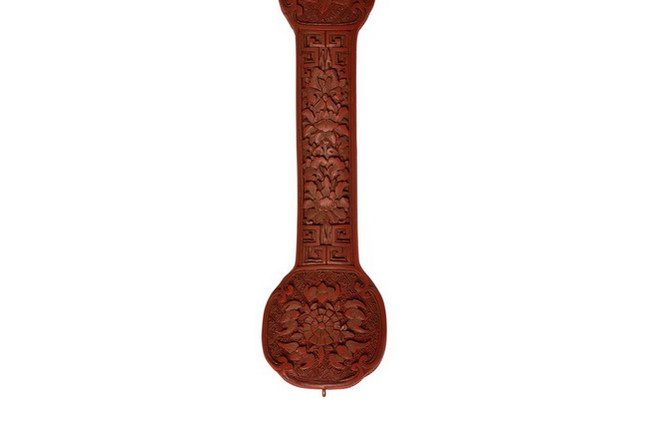 A finely carved Qing dynasty cinnabar lacquer scepter with patterns of blooming peony, double fish, and five bats, signifying double happiness, prosperities, and good fortune. The piece is completed with carved hardwood box. Qing Dynasty period.