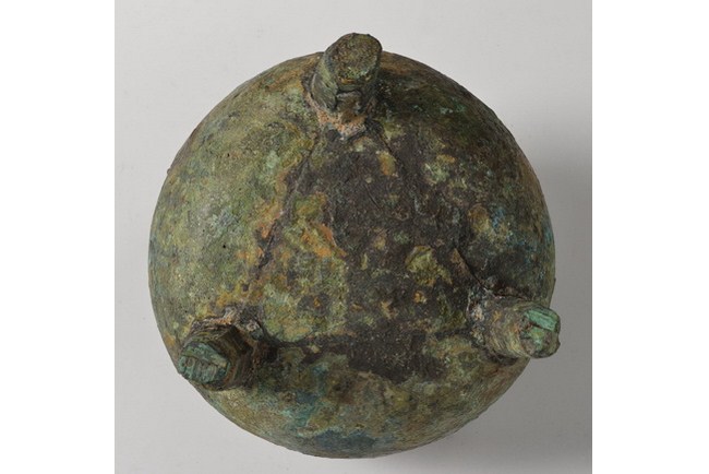 The Ding is of rounded form with very slight S-form profile, swollen lower section, a pair of upright U-form handles to each side of the everted rim, all supported on three tall columnar legs. Han Dynasty period.