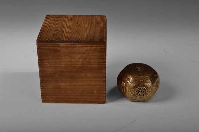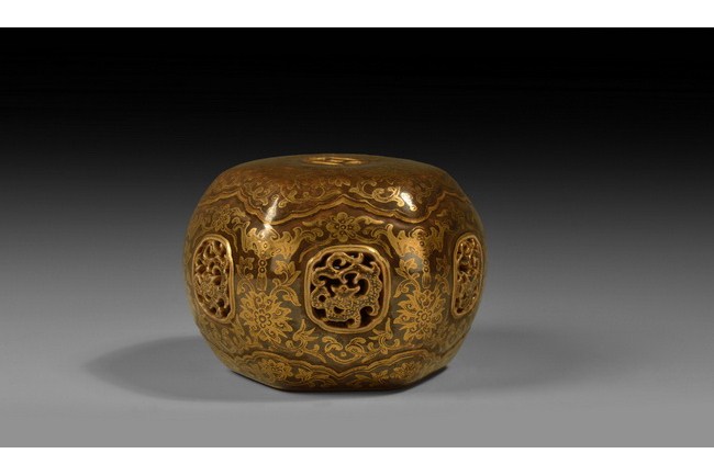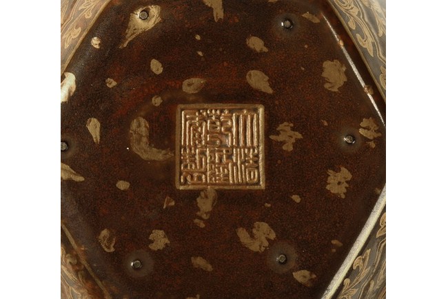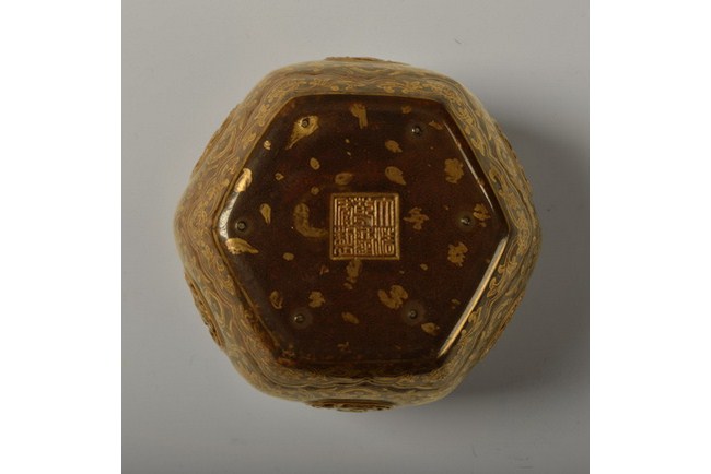 The ornament is in hexagonal shape, with gilt patterns of flowers, bats, mythical beasts, and coins. The bottom bears six character "QIANLONG" mark. Qing Dynasty Period