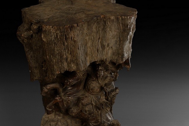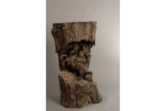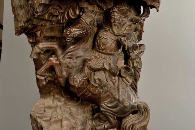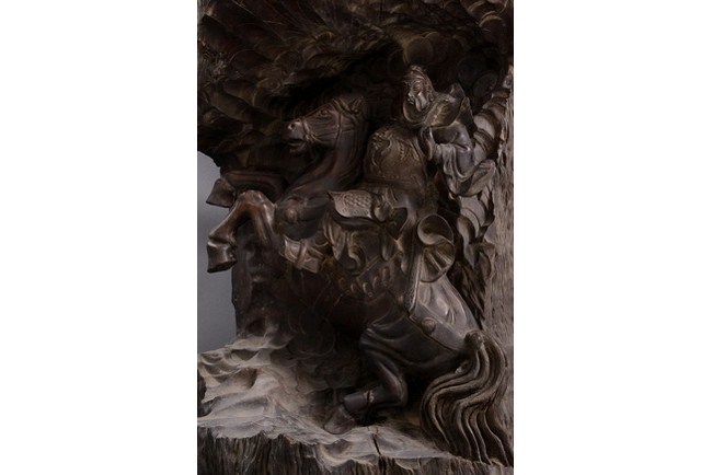 A solid trunk of Zitan wood carved in recess a fully armored Guandi riding on a galloping horse on a mountain path. Qing Dynasty period.