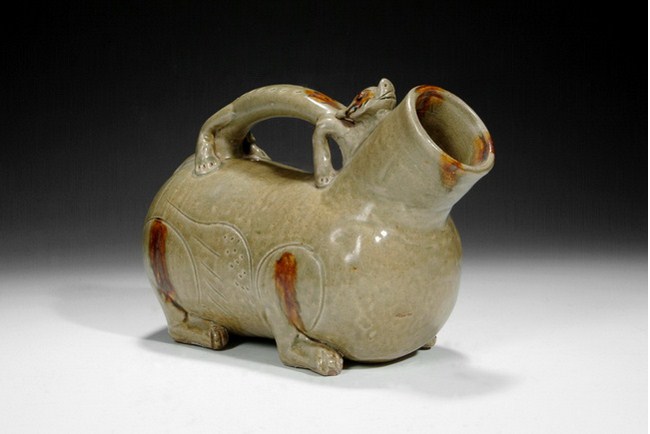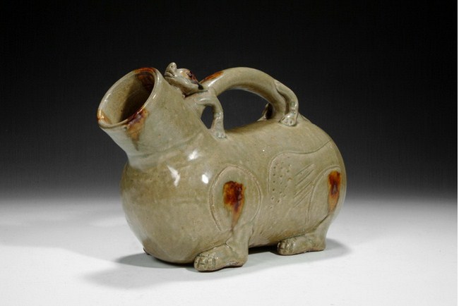 A green glazed urinal in the shape of tiger with a dragon handle on the top. Five Dynasties period.