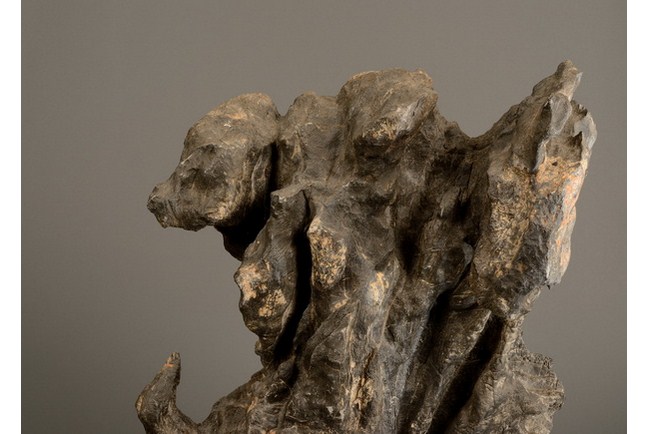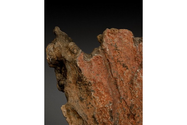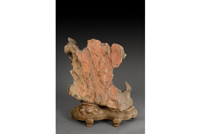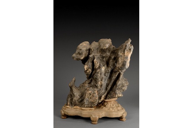 A large scholar rock with original carved wood base, possibly Lingbi stone. It is in the form of mountainous cliff.