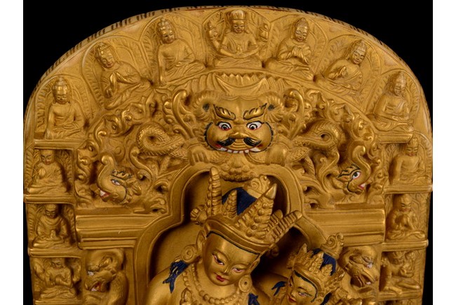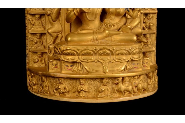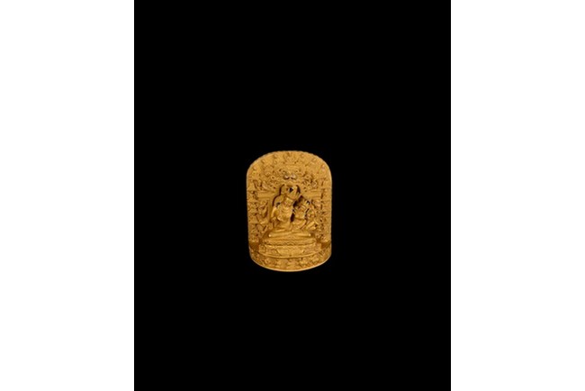 An exquisitely and delicately carved ivory pala relief panel, with a centrally seated Buddha and his attendant. The Buddha clad in a finely draped Sanghati, sit on a lotus pedestal beneath a canopy bearing mangos, flanked by a series of Buddha statues. The panel is gilt with cold applied gold, and the back bears a six character "XUANDE" mark. Ming Dynasty Period.