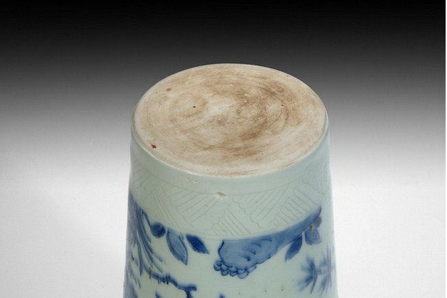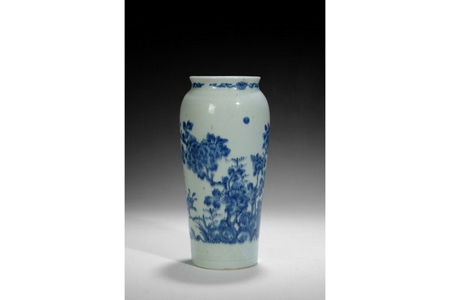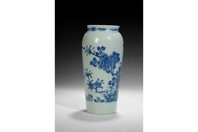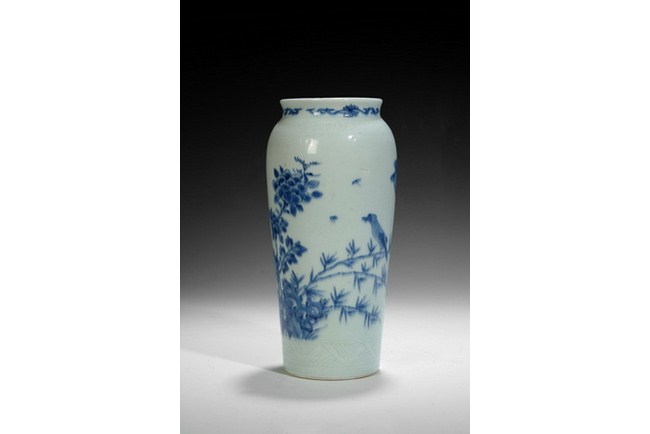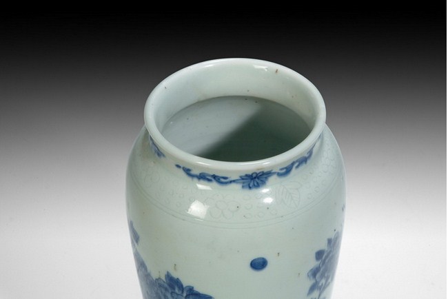 An underglaze blue and white baluster vase depicting a scene of birds and flowers. The vase stands on round base, graduates slowly to a short neck and everted rim. Unglazed bottom. Qing Dynasty Period.