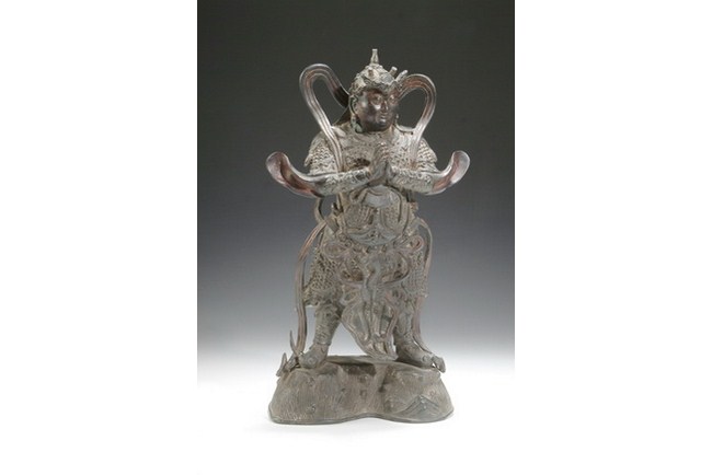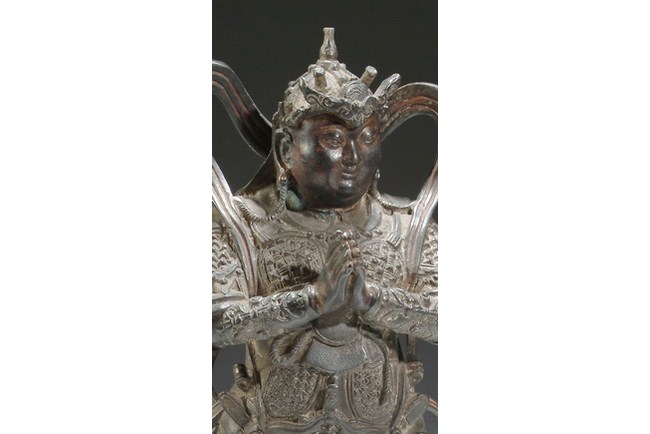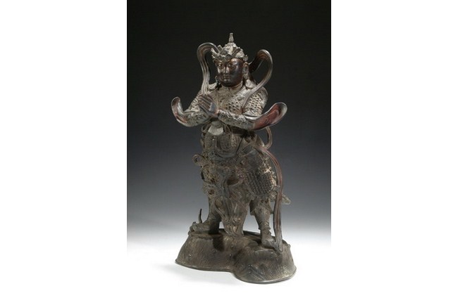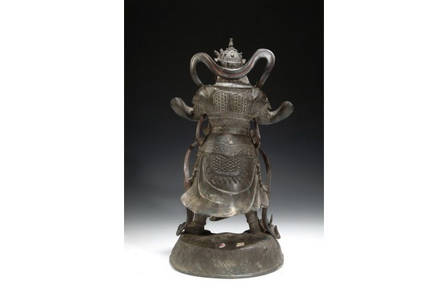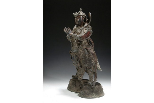 A bronze Wei Tuo statue cast in typical standing posture with both hands held in prayers. The piece is well casted with fine details in the armor, and it is standing on an integrated stone shaped base. The bottom is not sealed. Qing Dynasty period.