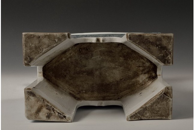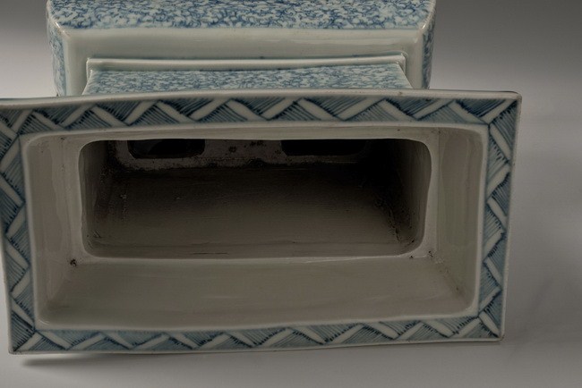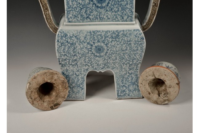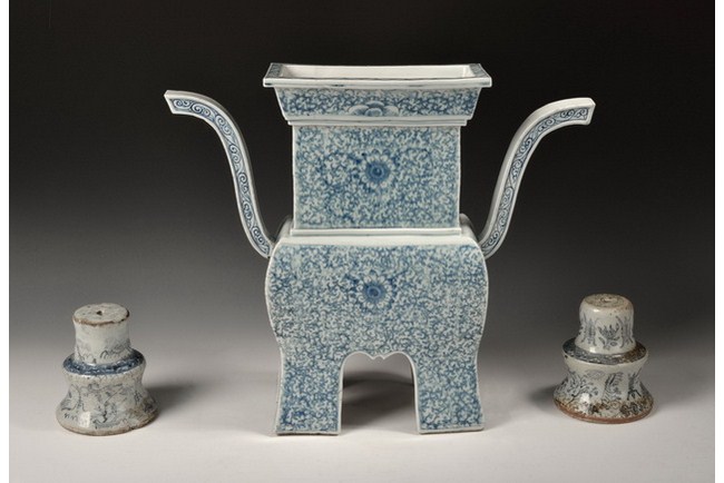 The set includes a square censer, and two round shaped porcelains. The square censer is supported by four straight legs, with two separated and uprising handles, and has a square rim. Flower patterns and ocean wave patterns can be seen on the censer. Qing Dynasty period.
