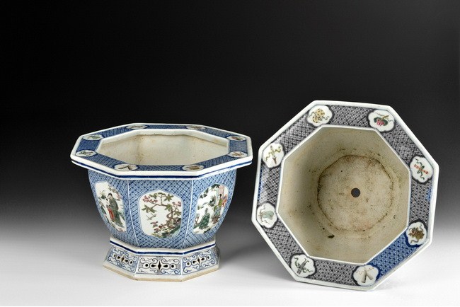 A pair of blue and white planters accentuated with famille rose design of people and blooming flowers in a garden setting. The pot has a wide rim, decorated with the Buddha's eight treasures. Republic period.