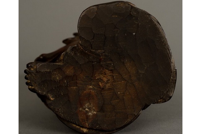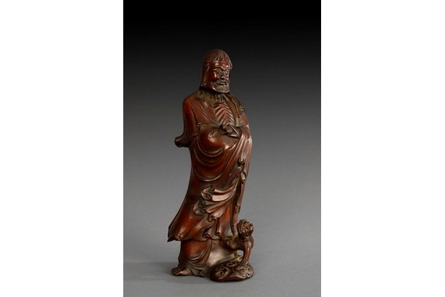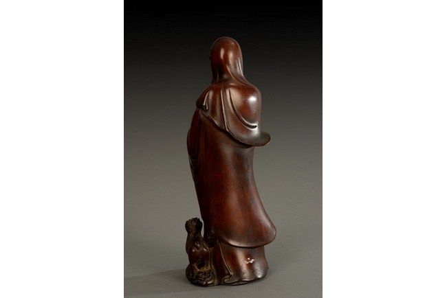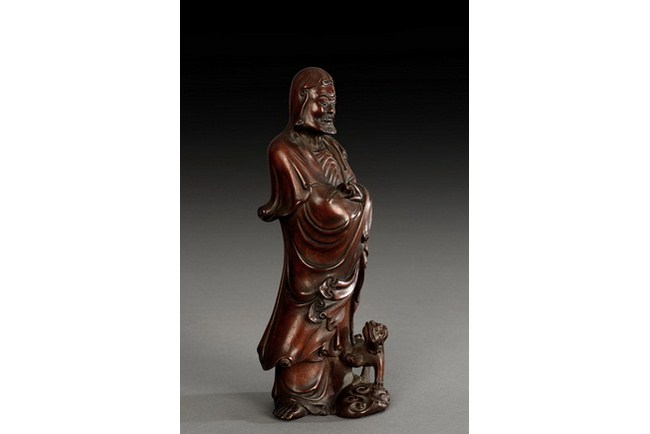 A well carved Huangyangmu Arhat with a flowing robe and serene facial features. At the foot, there is a small lion gazing at the Arhat. The surface of the piece is rich with beautiful patina. Qing Dynasty period.