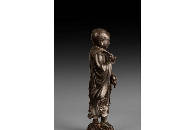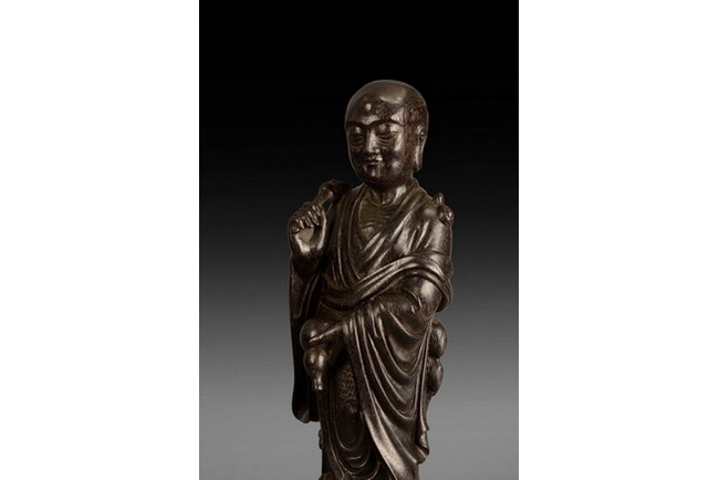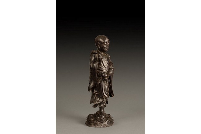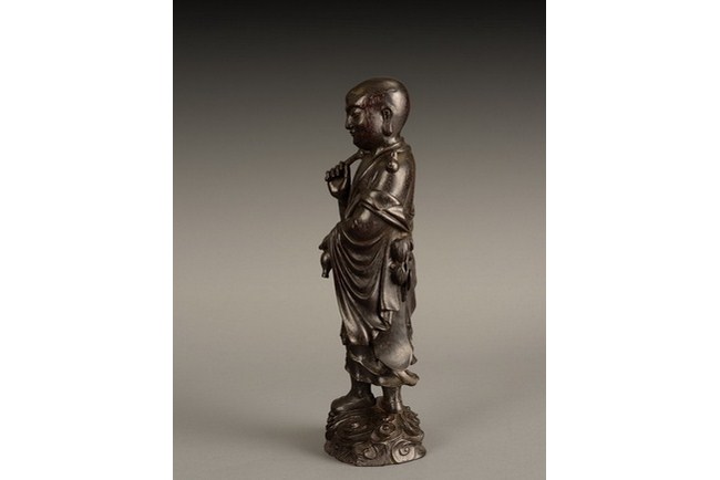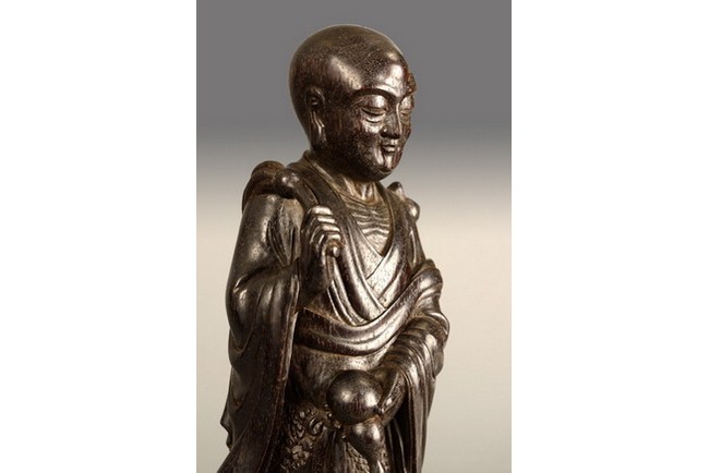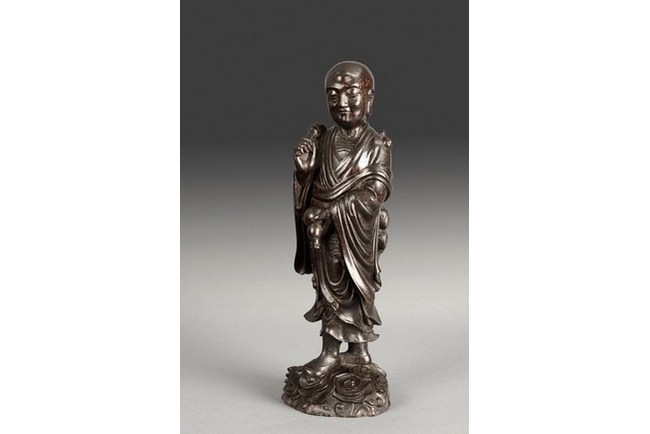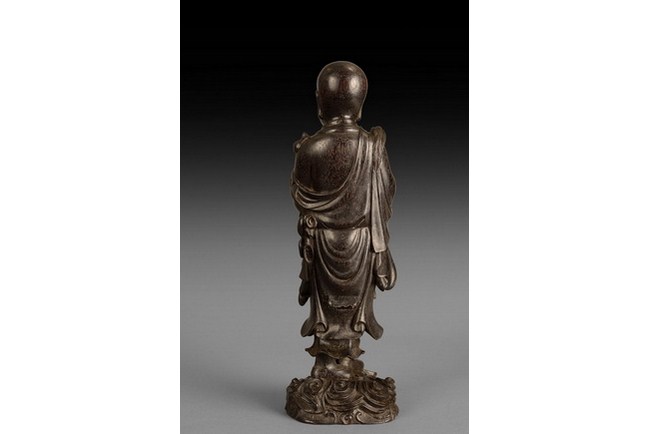 A well carved Zitan Arhat in a standing posture on top of a base carved with swirling cloud patterns. Qing Dynasty period.