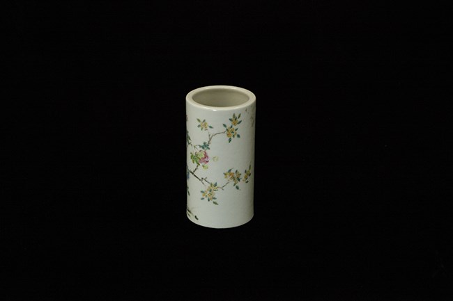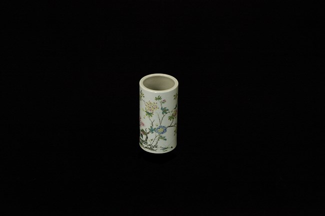 A small sized brush pot with enamel paintings of flowering branches, and the base bears a six characters "DAOGUANG" mark. Qing Dynasty period.