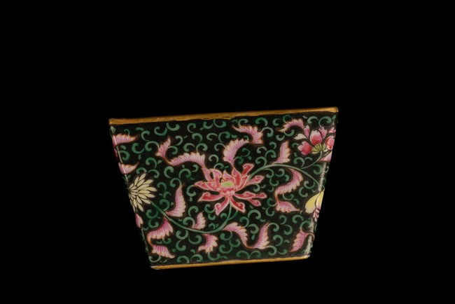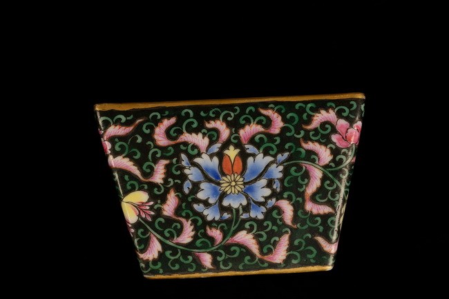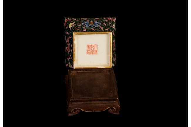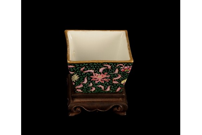 An enameled censer with designs of lotus blossom on four sides, and accentuated with gilt on the rim and base. It also bears a six character "QIANLONG" mark. The piece is completed with a Zitan stand. Qing Dynasty period.