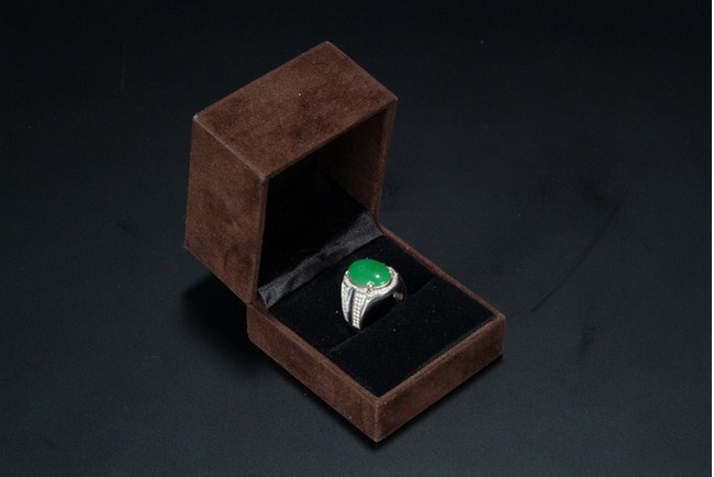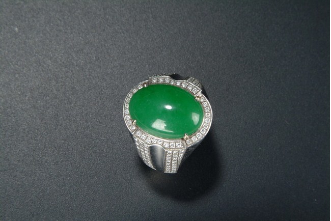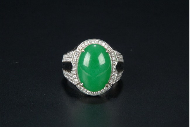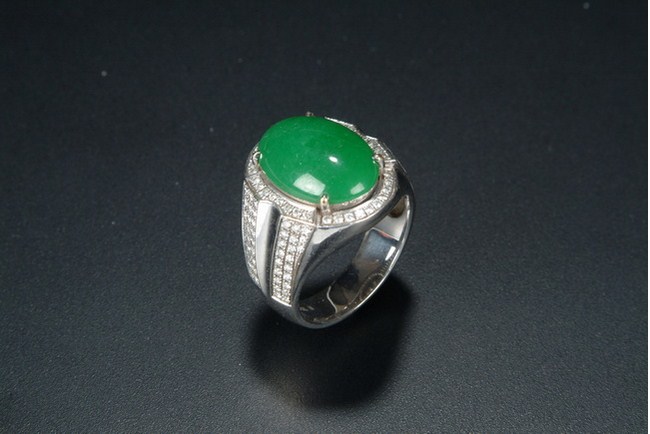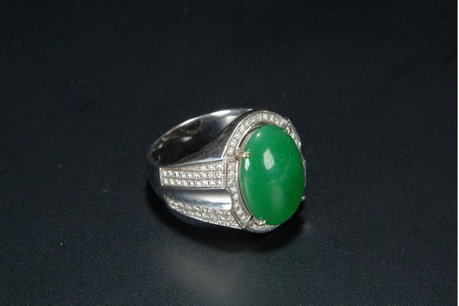 A 18k white gold lady's ring with apple green color jadeite stone, accented with small rose cut diamonds.