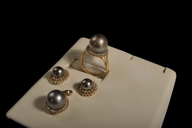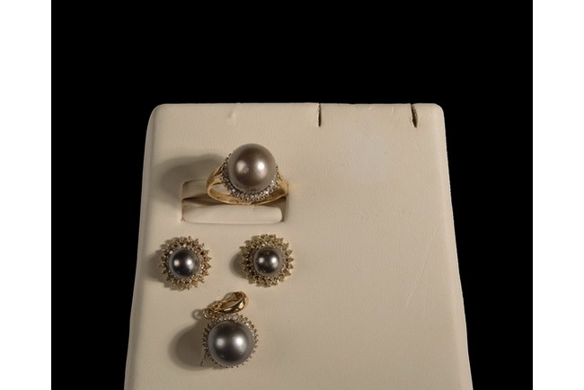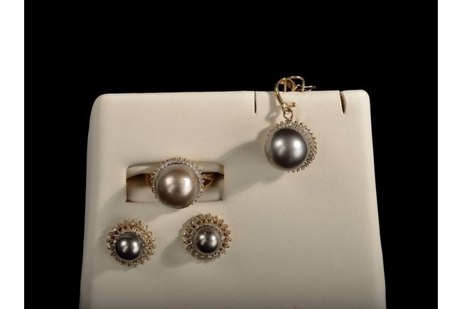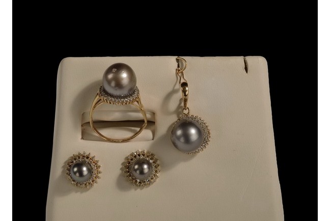 The set includes a ring, a pendant, and a pair of earrings. Tahitian natural black pearl ring, 12 mm, with 1.01 carat diamond, 14k two tone yellow and white gold. Tahitian natural black pearl pendant, 11.7 mm, 1.02 carat diamond, 14k two tone yellow and white gold. Tahitian natural black pearl earrings, 7.6 mm each with 2 carat diamond, 14k two tone yellow and white gold.