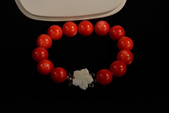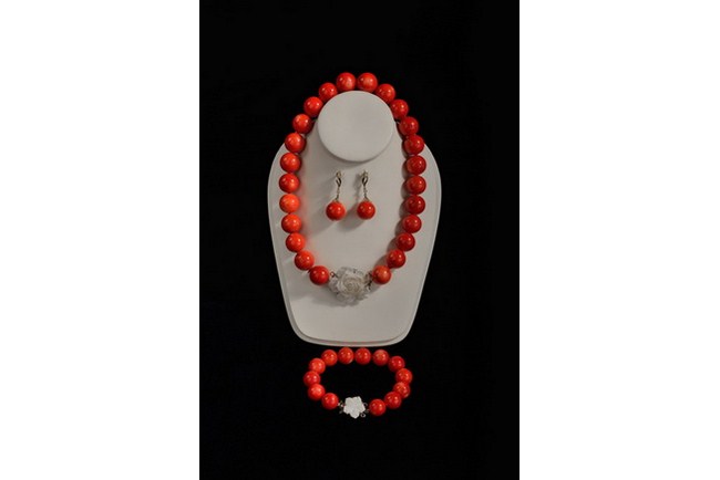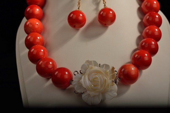 The set includes a natural coral necklace with mother pearl clasp, a natural coral bracelet with mother pearl clasp, and a natural coral earrings with 0.05 carat diamond & 14 K yellow gold.