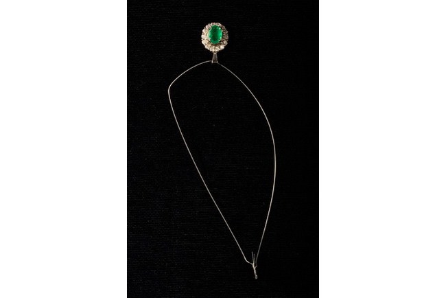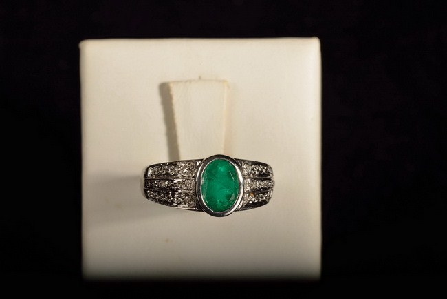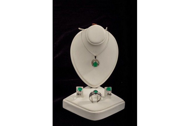 The set includes a pendant, a ring, and a pair of earrings. Columbian natural emerald pendant center 2.05 carat with diamond 0.80 carat, 18 K white gold. Columbia natural emerald ring center 1.50 carat, 14k white gold, with diamond 0.82 carat. Columbia natural emerald earrings, each 2.29 carats, 14k white gold, with diamond 0.65 carat.