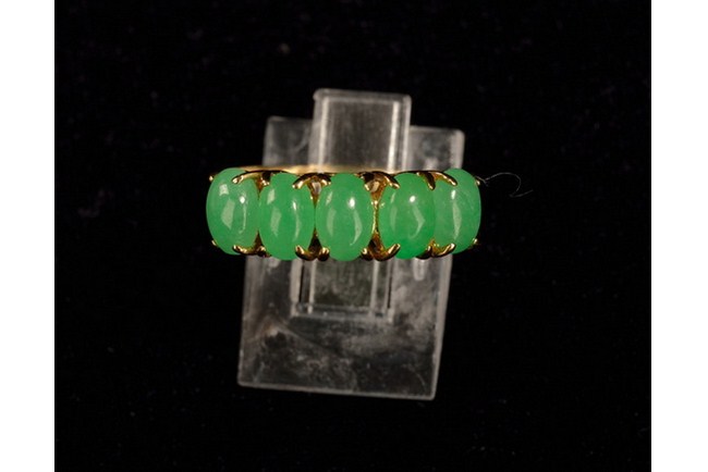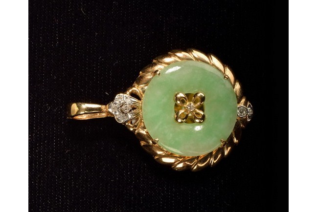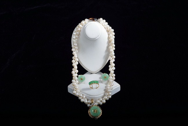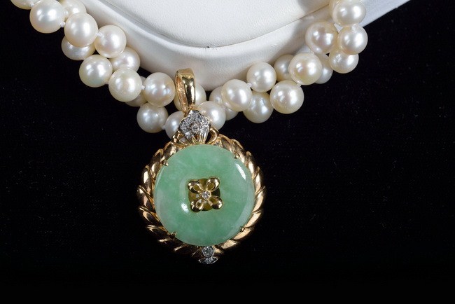 The set includes a necklace, a pair of earrings, and a ring. Japanese cultural pearl necklace 7.5 mm-7 mm, length 19 in, 2 strand, with Jade pendant 1.8 in X 1.8 in 14k yellow gold, 0.25 carat diamond. Natural jade earrings, 0.6 in by 0.6 in, with 18k yellow gold. Natural jade ring 5 pieces, 0.2 in x 0.3 in with 14k yellow gold.