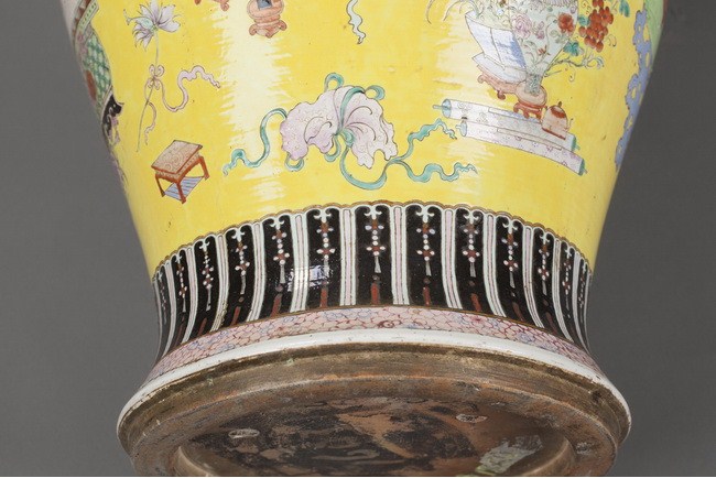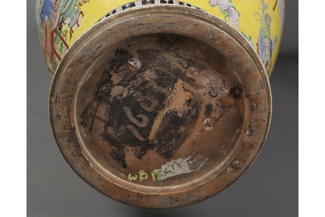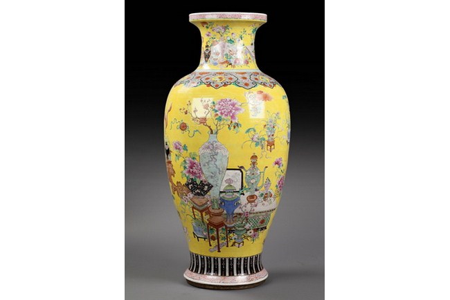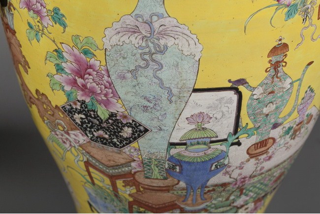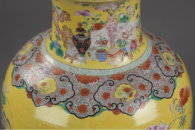 "A very large yellow ground famille rose vase depicting various flowers all around.The bottom is unglazed and foot ring has decorated black patterns circling around. The shoulder of the vase is covered with a floral pattern and rises to a long neck with a wide mouth."