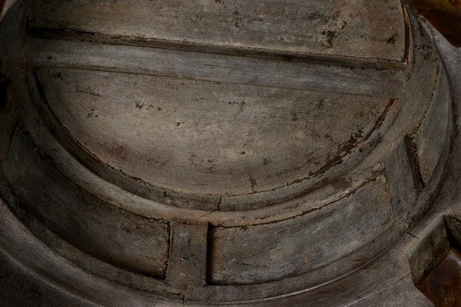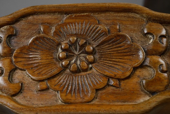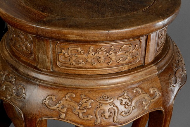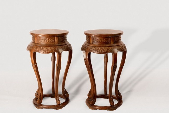 A pair of circular form Huanghuali flower stands rest on five scroll legs, and on the circular base. The shoulders of the stand is reveal carved with pairs of confronting Chilong. Early Republic period.
